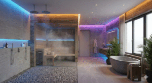 A novidade fica por conta da introdução de tecnologias de saúde: espelhos inteligentes que analisam a pele, chuveiros com infusão de vitaminas e saunas secas compactas desenhadas com madeira nobre e vidro, integradas visualmente ao quarto.